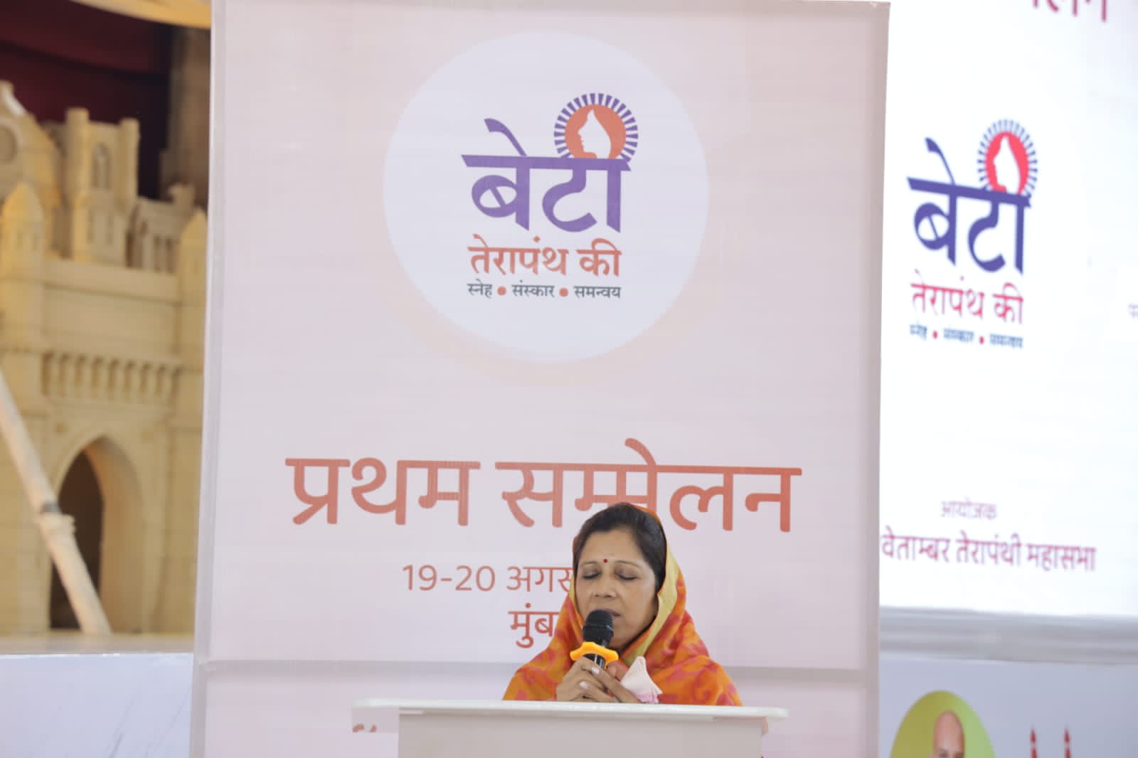 इस सम्मेलन के संदर्भ में ‘बेटी तेरापंथ की’ की संयोजिका श्रीमती कुमुद कच्छारा ने अपनी अभिव्यक्ति दी। सहसंयोजिका श्रीमती वन्दना बरड़िया से बेटियों से परिसंवाद किया तो बेटियों के भावपूर्ण संवाद से पूरे माहौल को स्नेहिल बना दिया। महासभा के अध्यक्ष श्री मनसुखलाल सेठिया ने भी इस संदर्भ में अपनी अभिव्यक्ति दी। मुम्बई से संबंधित बेटियों ने गीत का संगान किया। बेटियां अपने सम्मेलन के शुभारम्भ में ही गुरुमुख से प्रेरणा प्राप्त कर तृप्ति का अनुभव कर रही थीं।